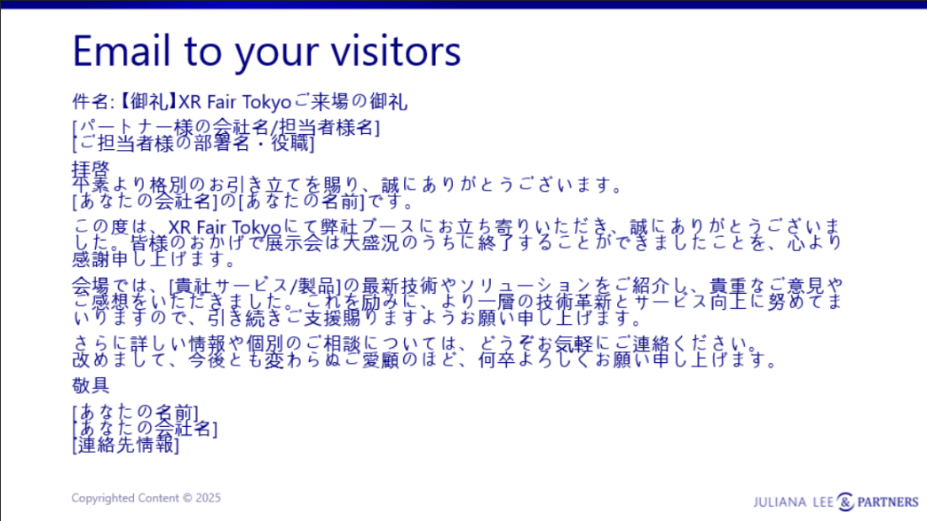 - SNS/홈페이지 공지: “XR Fair Tokyo 참가 후기” 콘텐츠를 게시해, 잠재 고객 및 파트너가 자연스럽게 접촉할 수 있도록 유도.